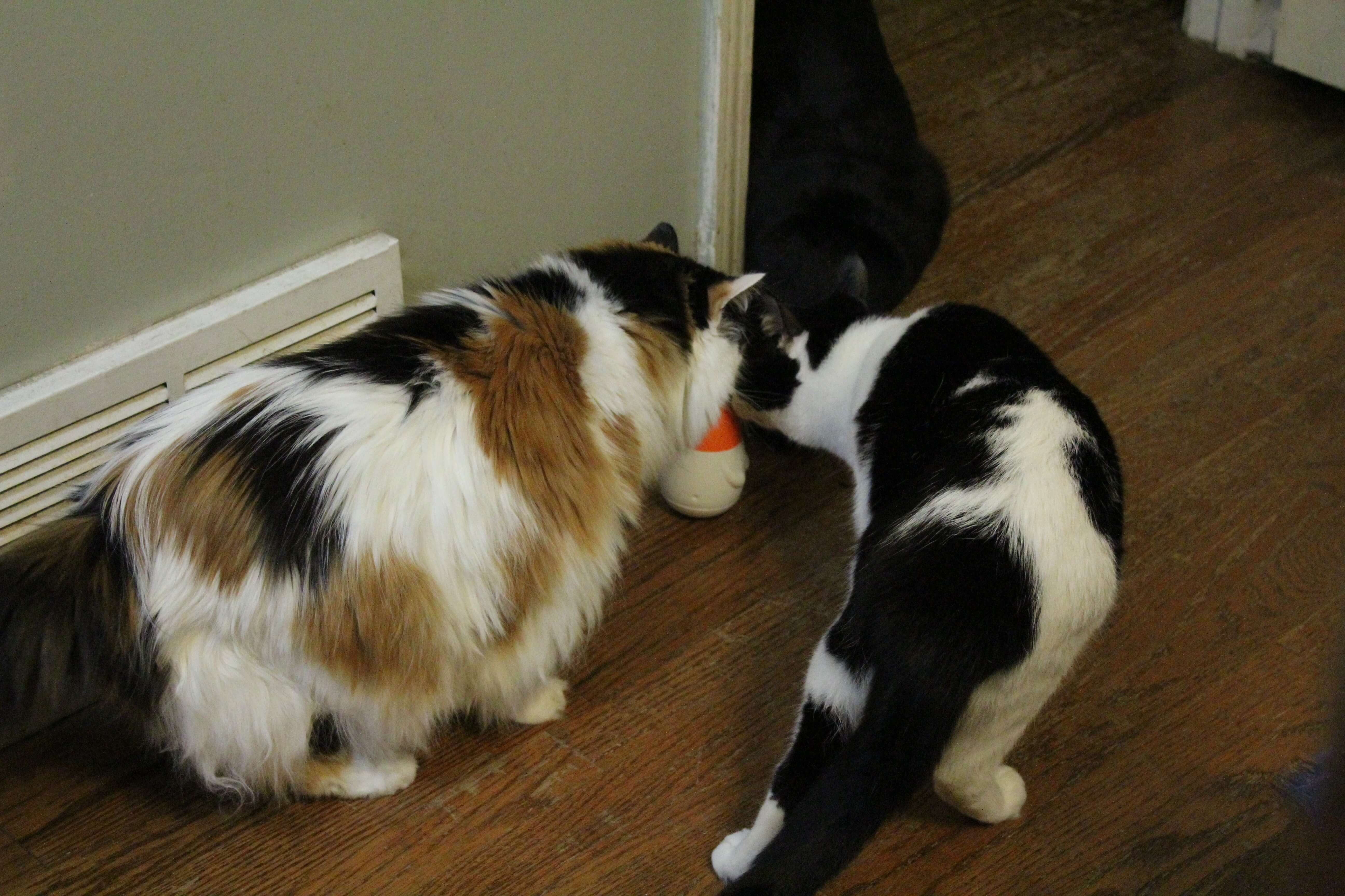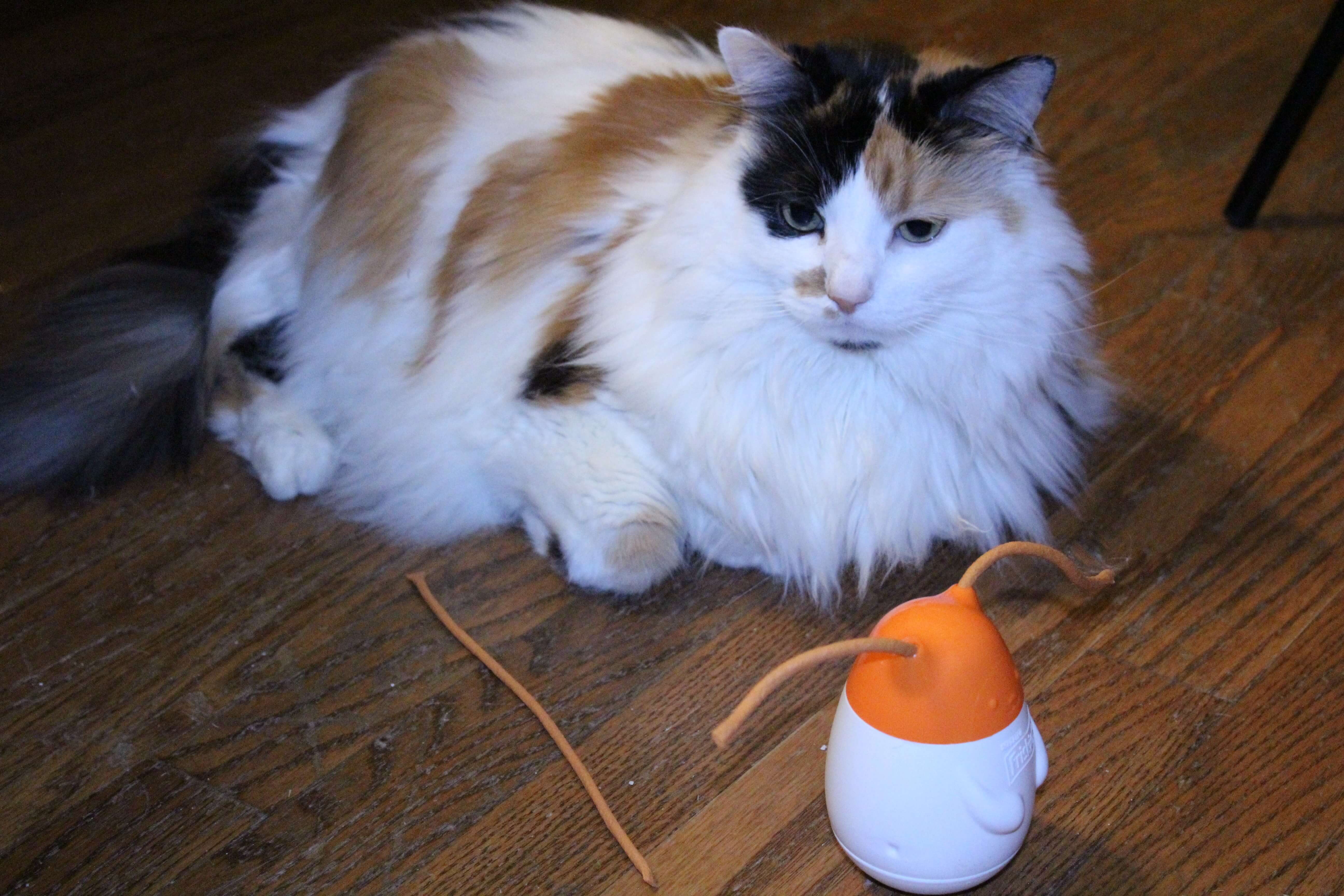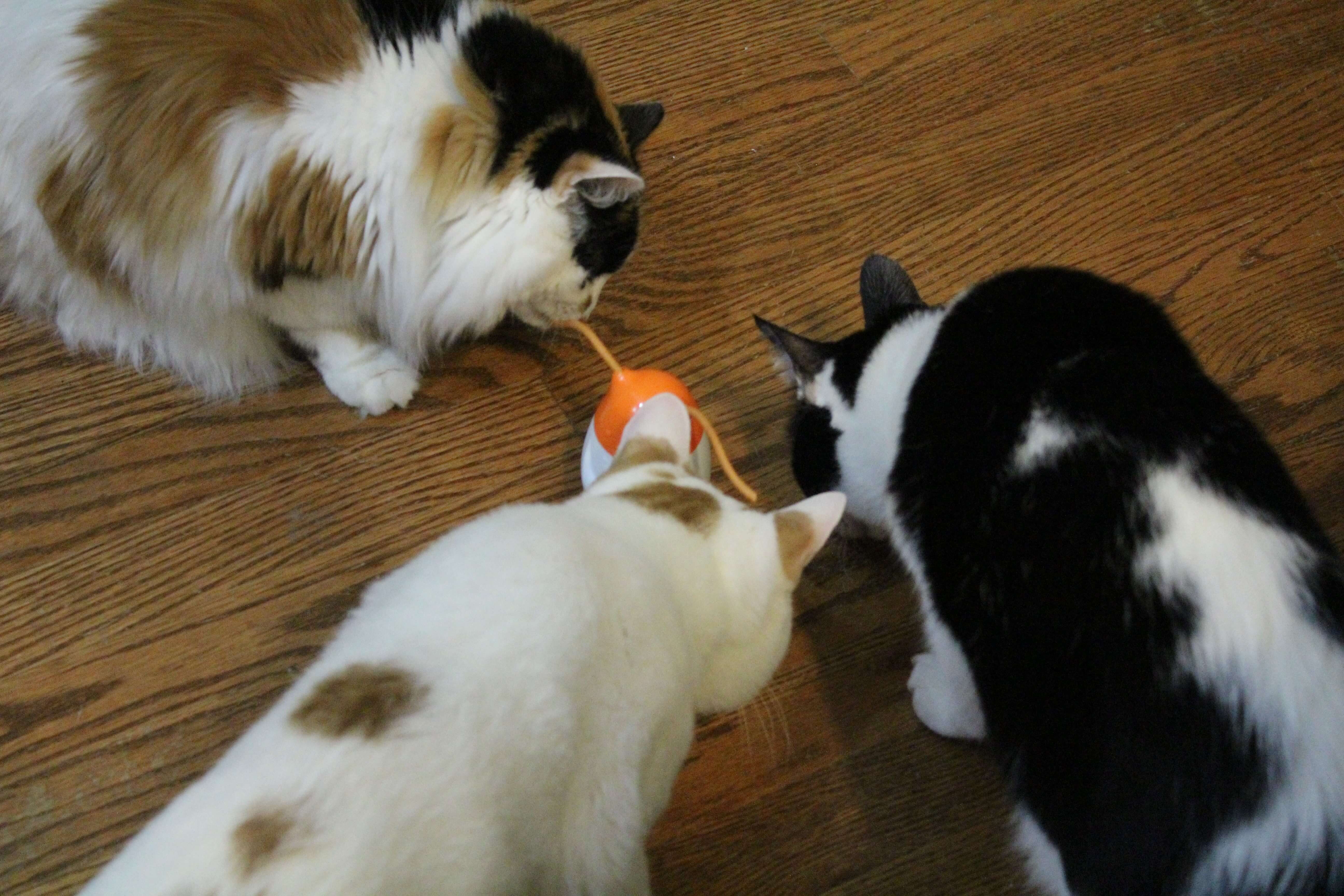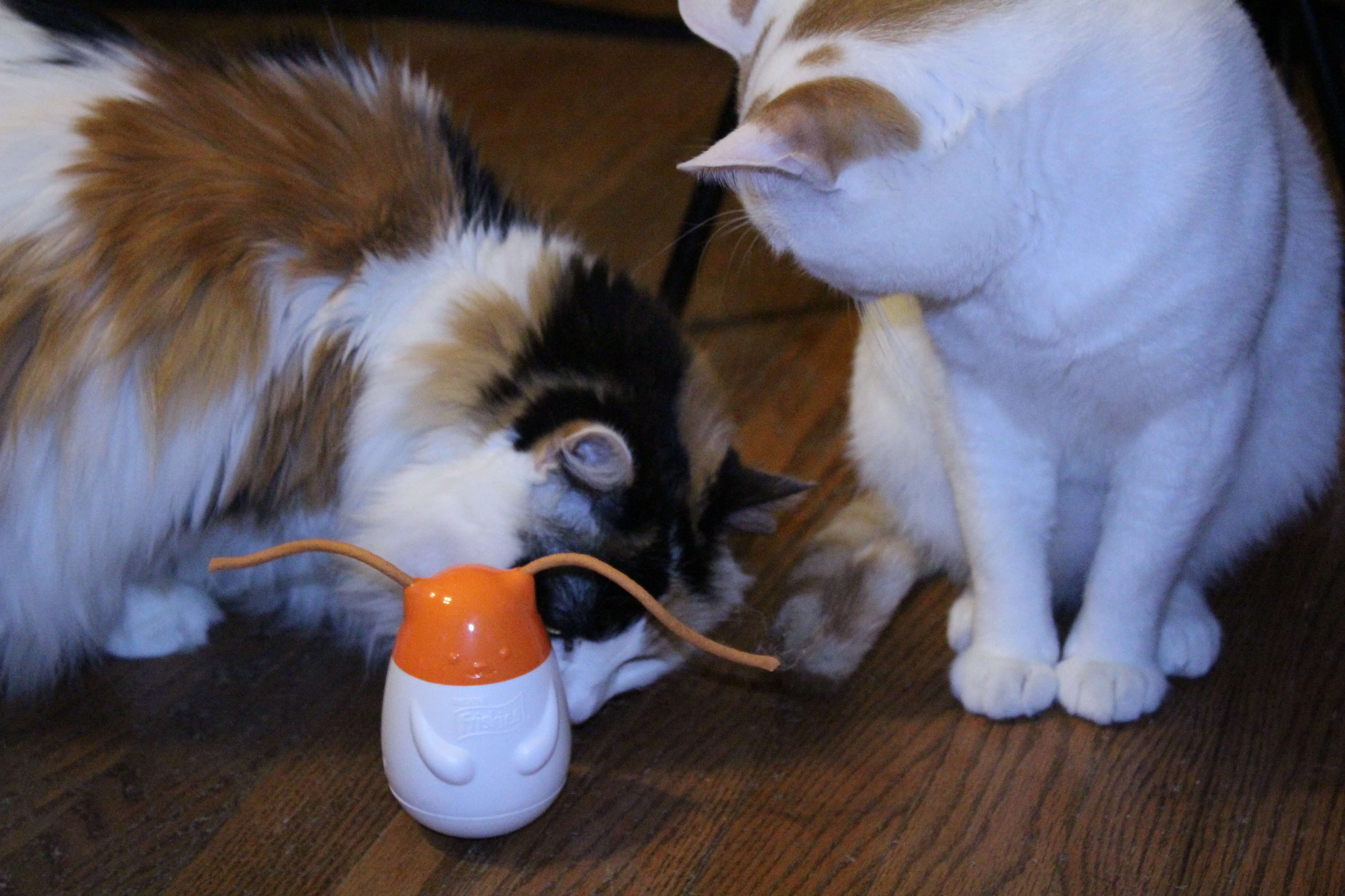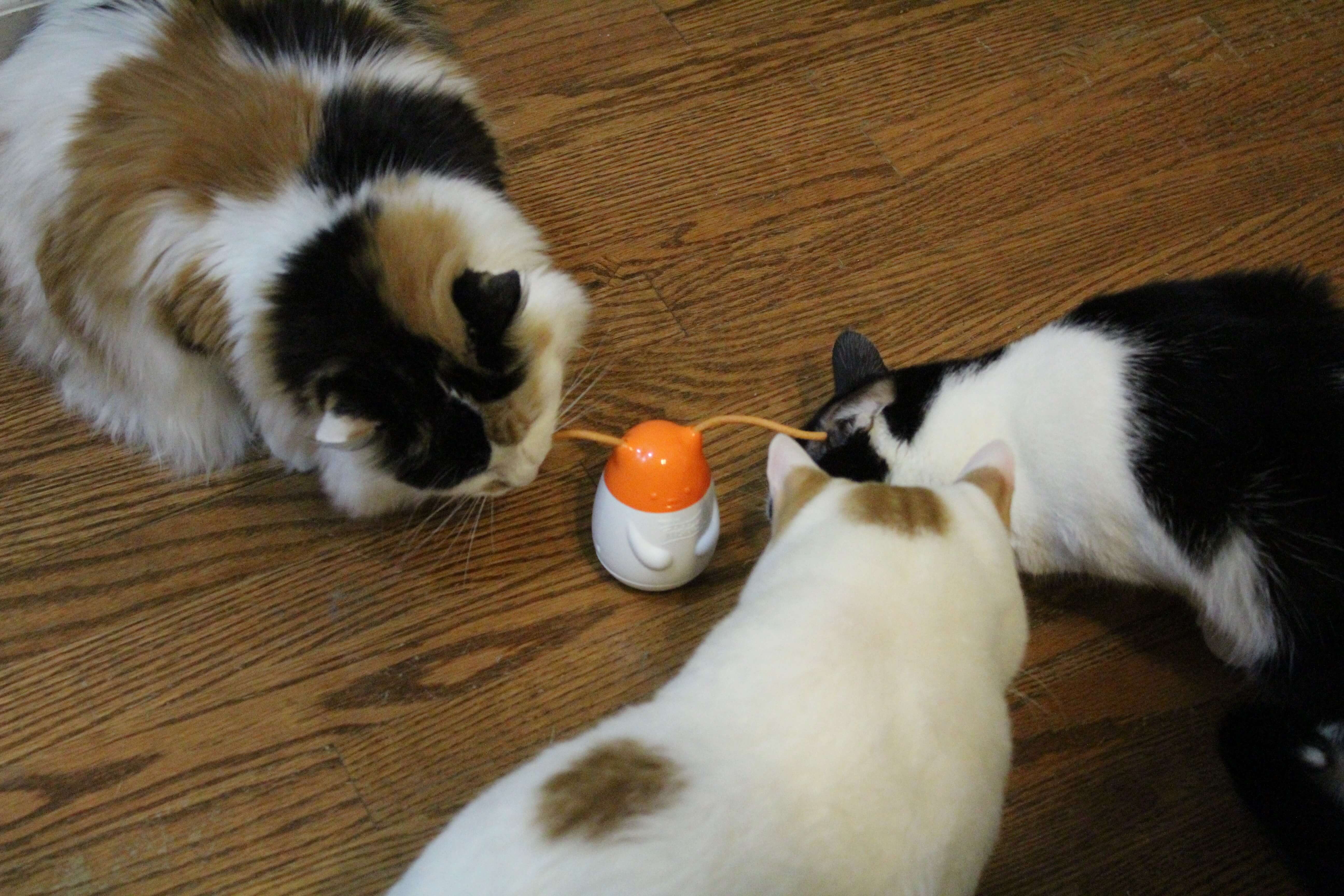 We alternated between the wobbler and dangling the Pull N Play cat treat strings in front of the cats. The cats would just bite and swipe at the strings for a while. Then they would paw at the wobbler a bit. Back and forth. Even after they had enough treats, they were still playing.
